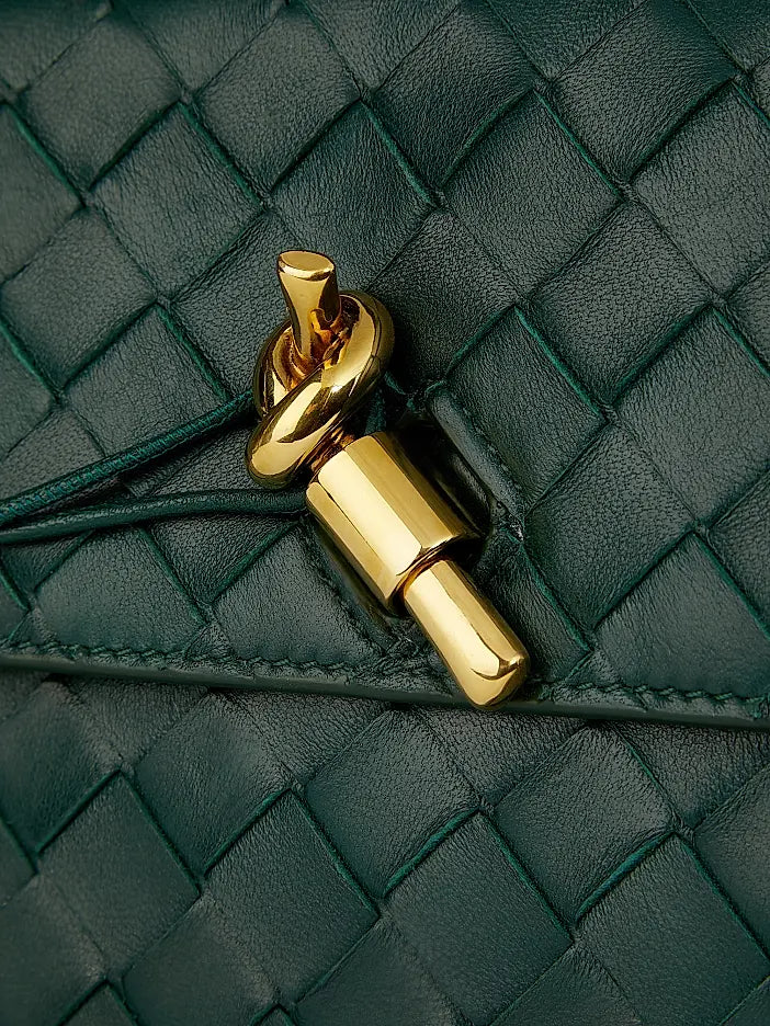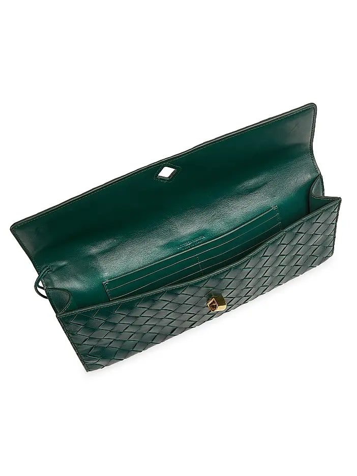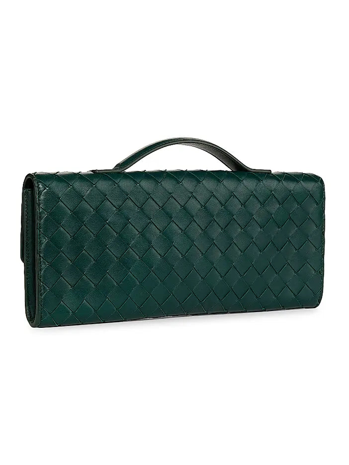 This green woven clutch combines timeless design with functional details. Crafted in a rich, textured weave, it opens to a lined interior featuring a secure zip pocket on one side and a card slot on the opposite side for organized storage. Designed with versatility in mind, it comes with a detachable and adjustable shoulder strap, allowing it to be carried as a clutch, worn on the shoulder, or styled crossbody. A sculptural clasp closure completes the look with a refined finish, making it ideal for both evening events and chic daytime outings.