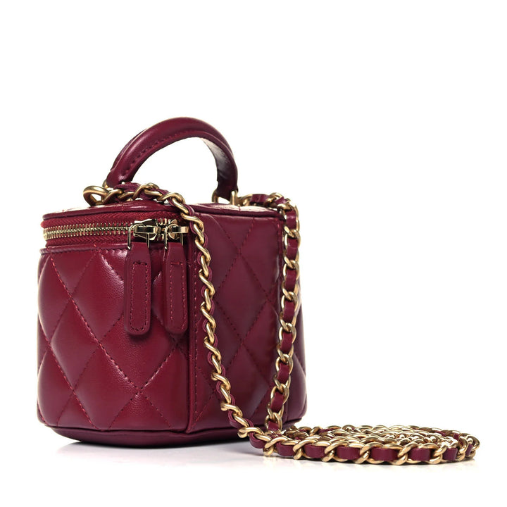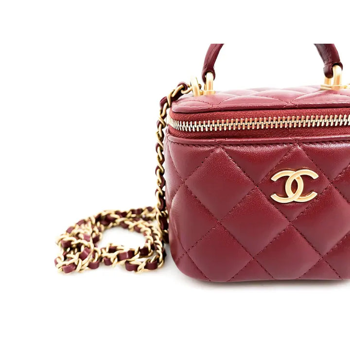 The structured silhouette opens with a smooth zipper to reveal a spacious interior, complete with an interior band for small essentials and a built-in vanity mirror for flawless touch-ups on the go. A top handle adds chic versatility, while the gold-tone chain-and-leather strap gives you hands-free elegance.