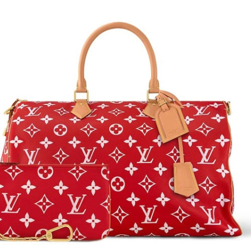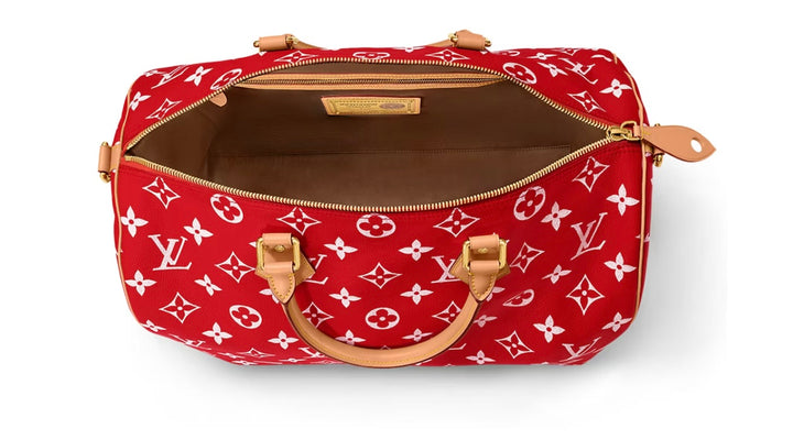 Turn heads with this stunning red and white monogram-pattern handbag, designed in the classic Speedy silhouette. Crafted with high-quality materials, this beauty features a structured shape with double top handles, a secure zip-top closure, and signature detailing throughout. Spacious enough for everyday essentials yet elegant for any occasion, this 30 cm design combines timeless style with modern flair.