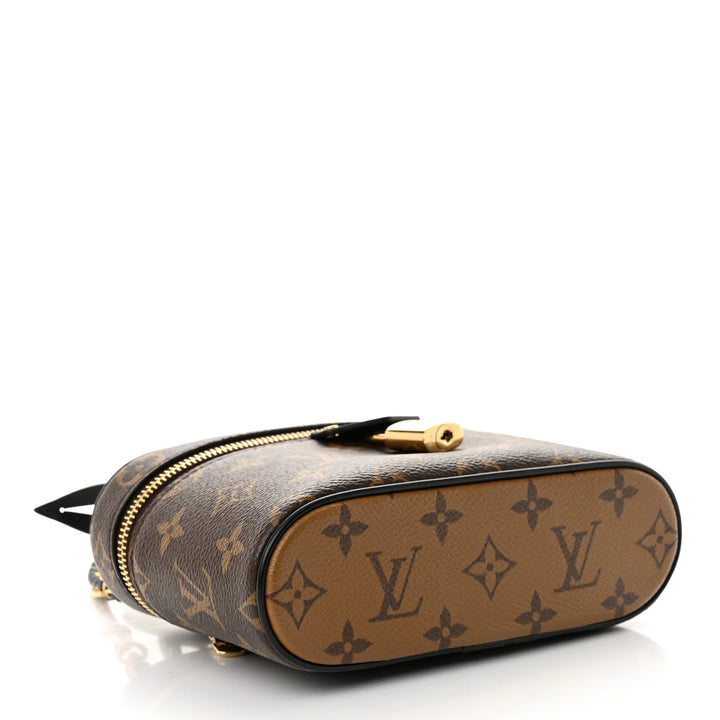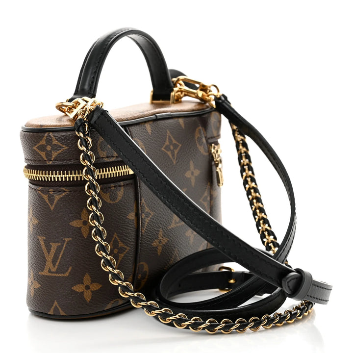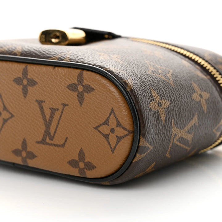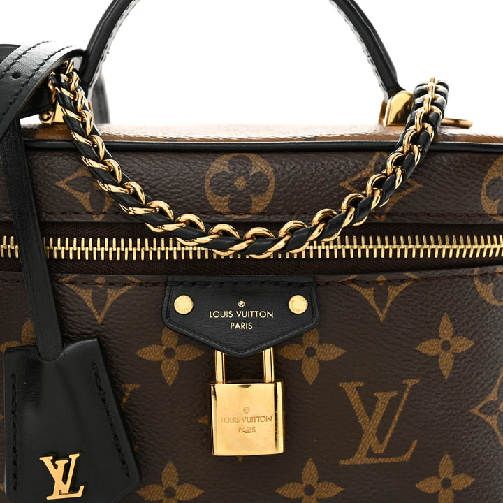 Step into style with this elegant reverse monogram vanity bag — a stunning mix of modern design and timeless luxury. Crafted with a sleek structured silhouette, it features contrasting monogram tones that add depth and sophistication. The gold-tone hardware shines beautifully, paired with a matching tag engraved in gold for a polished finish.