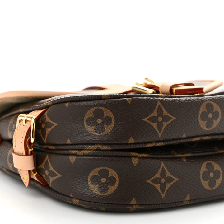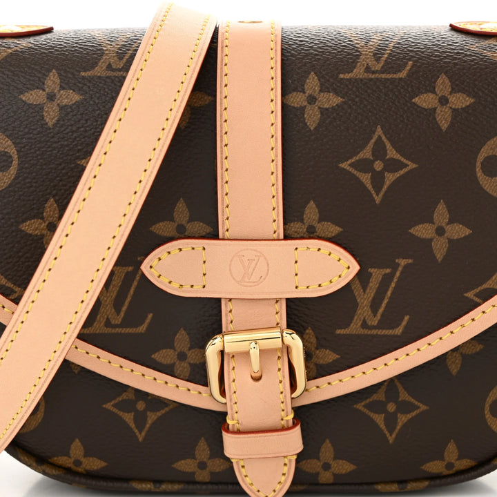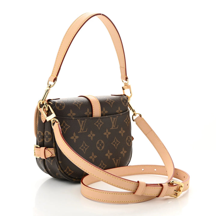 Elevate your everyday style with this beautifully crafted Saumur BB–style crossbody bag. Designed in iconic monogram canvas with natural leather trim, this bag blends timeless elegance with modern versatility. The structured saddle silhouette features a front buckle-detail closure, smooth edging, and rich gold-tone hardware for a polished finish.