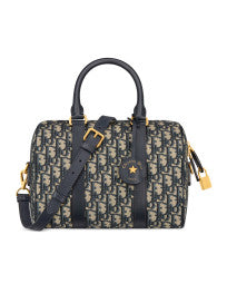 This luxury satchel features a secure zip-top closure accented by a statement padlock and matching leather keyholder charm, detailed with retro gold-tone stars and keys for a chic touch. The dual rolled-leather handles and an adjustable, removable leather shoulder strap allow for multiple ways to wear—handheld, on the arm, or crossbody.